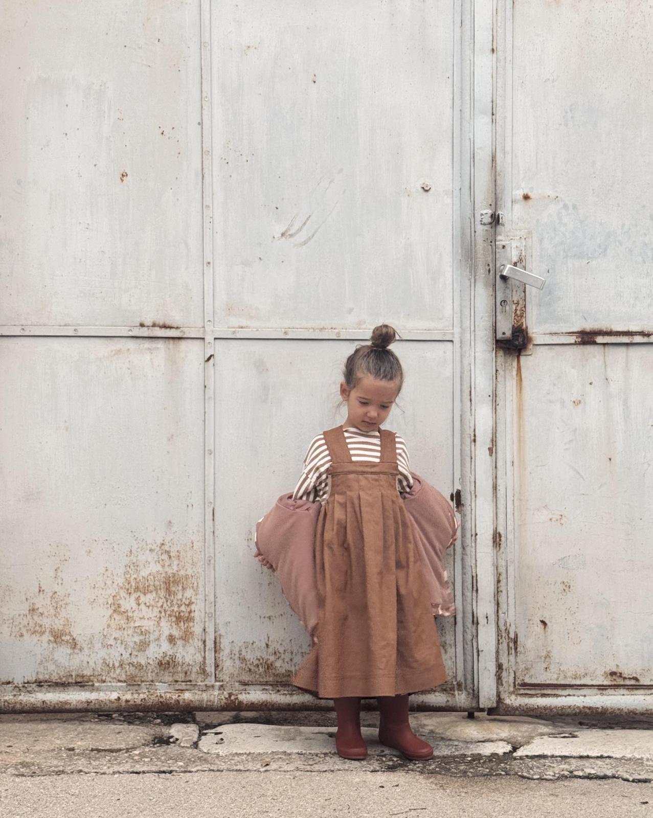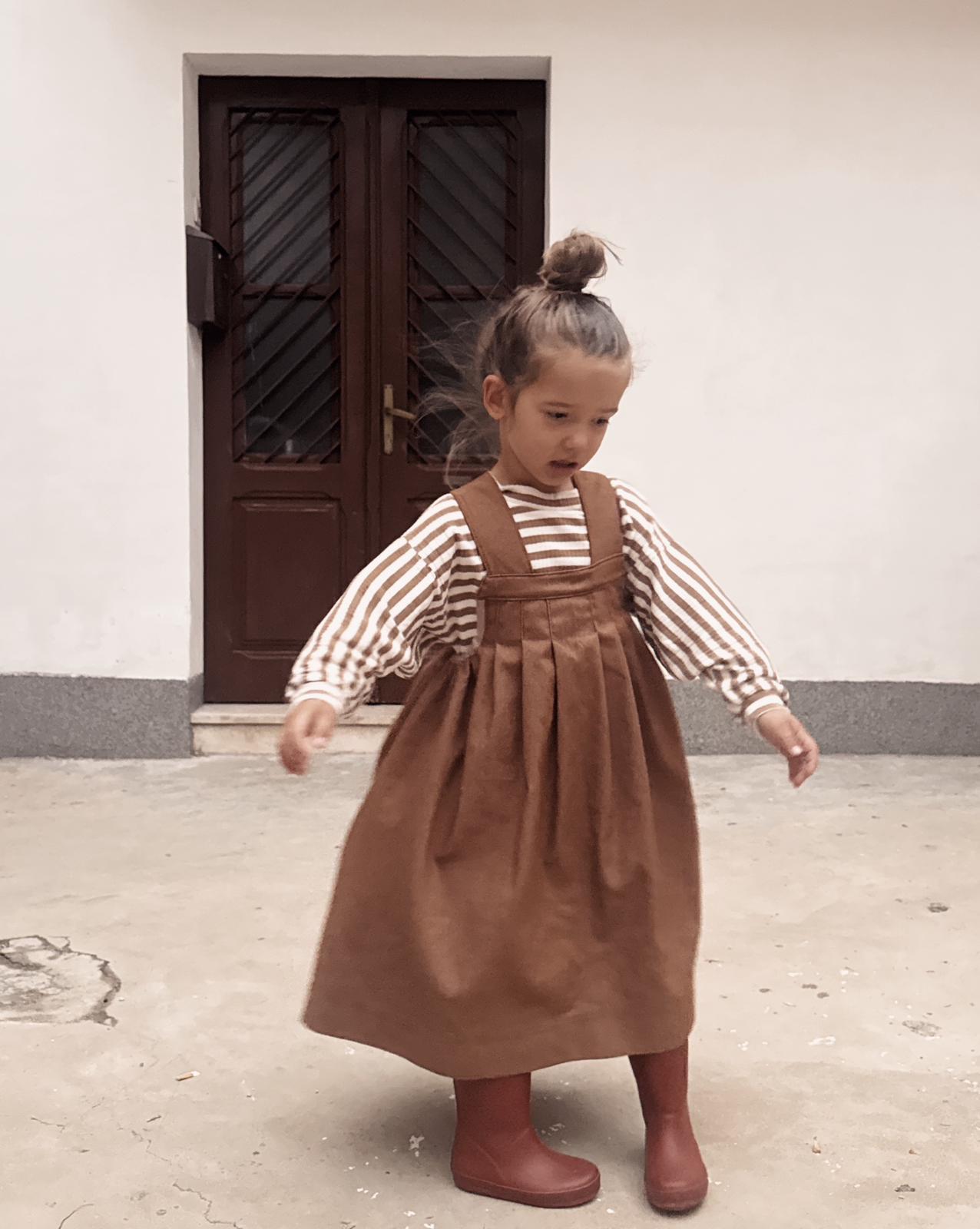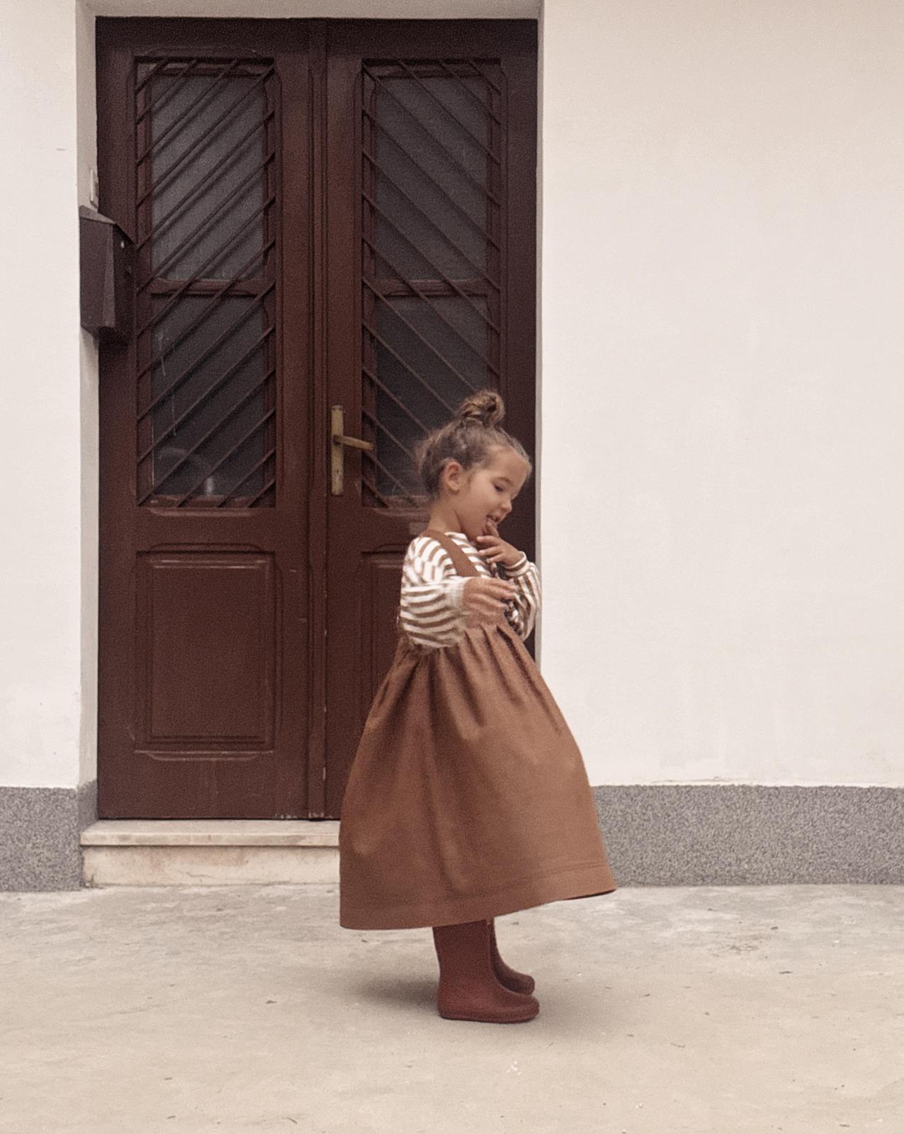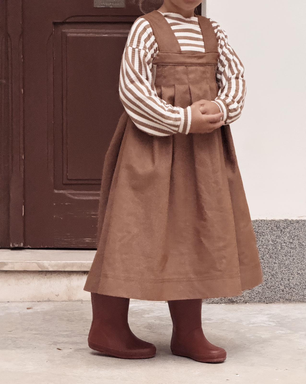 Un completo versatile e raffinato che combina eleganza e comfort. L'abito prendisole in morbido tessuto naturale color cammello presenta spalline regolabili e pieghe sul petto per un tocco femminile. La maglia a righe marrone e panna in cotone di alta qualità completa perfettamente l'outfit, creando un look armonioso e senza tempo.