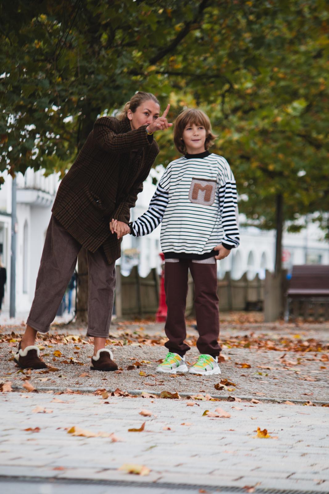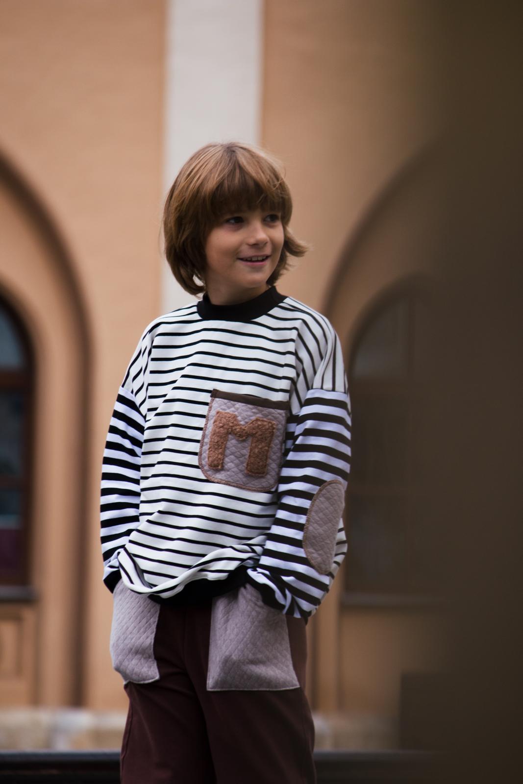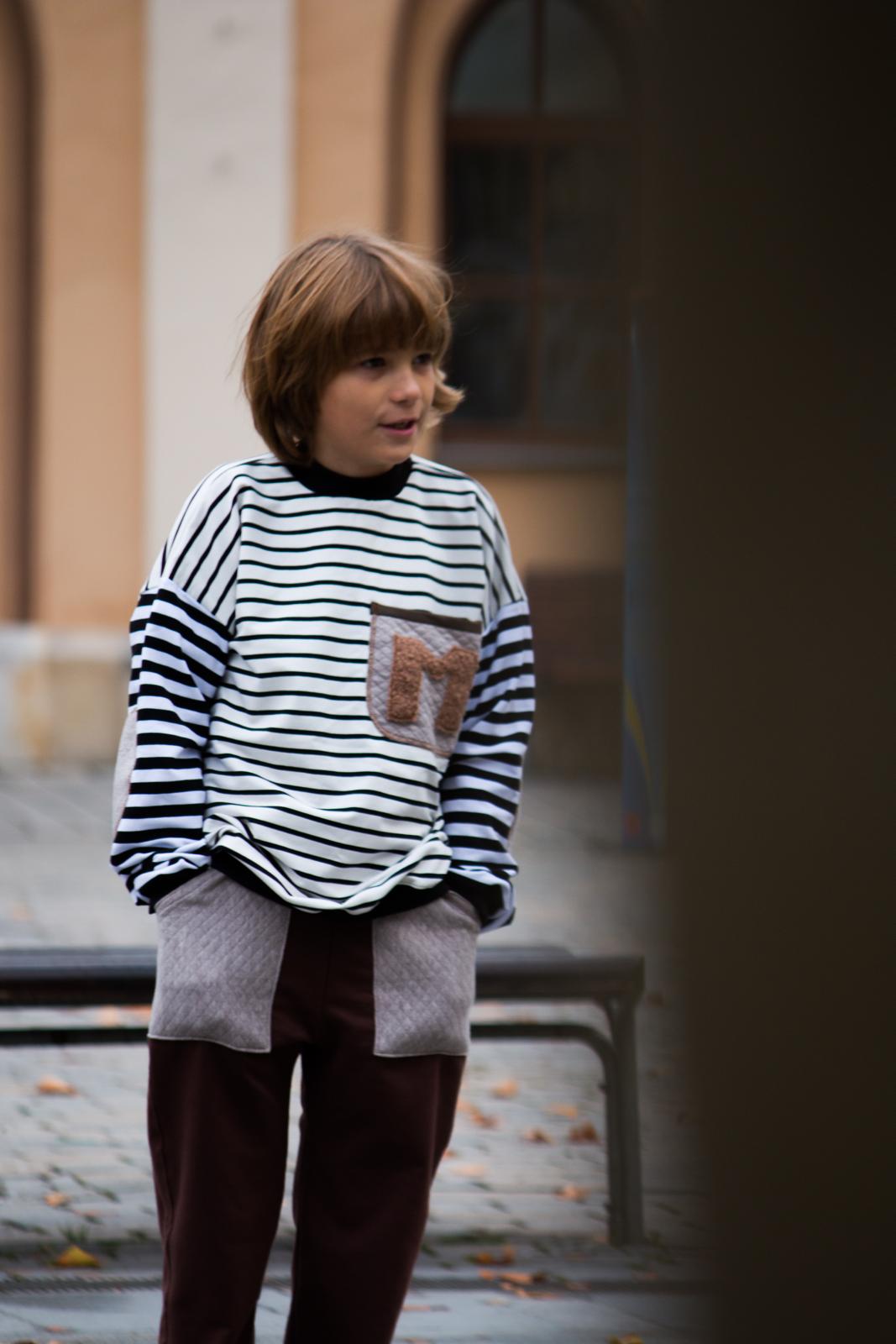 Un completo casual-chic che unisce stile marinaro e comfort. La felpa presenta un raffinato mix di righe sottili e larghe bianche e nere, con un dolcissimo taschino in spugna marrone decorato con un'iniziale ricamata. Il collo a lupetto nero aggiunge un tocco elegante. I pantaloni marroni in cotone completano l'outfit con un colore caldo e versatile.