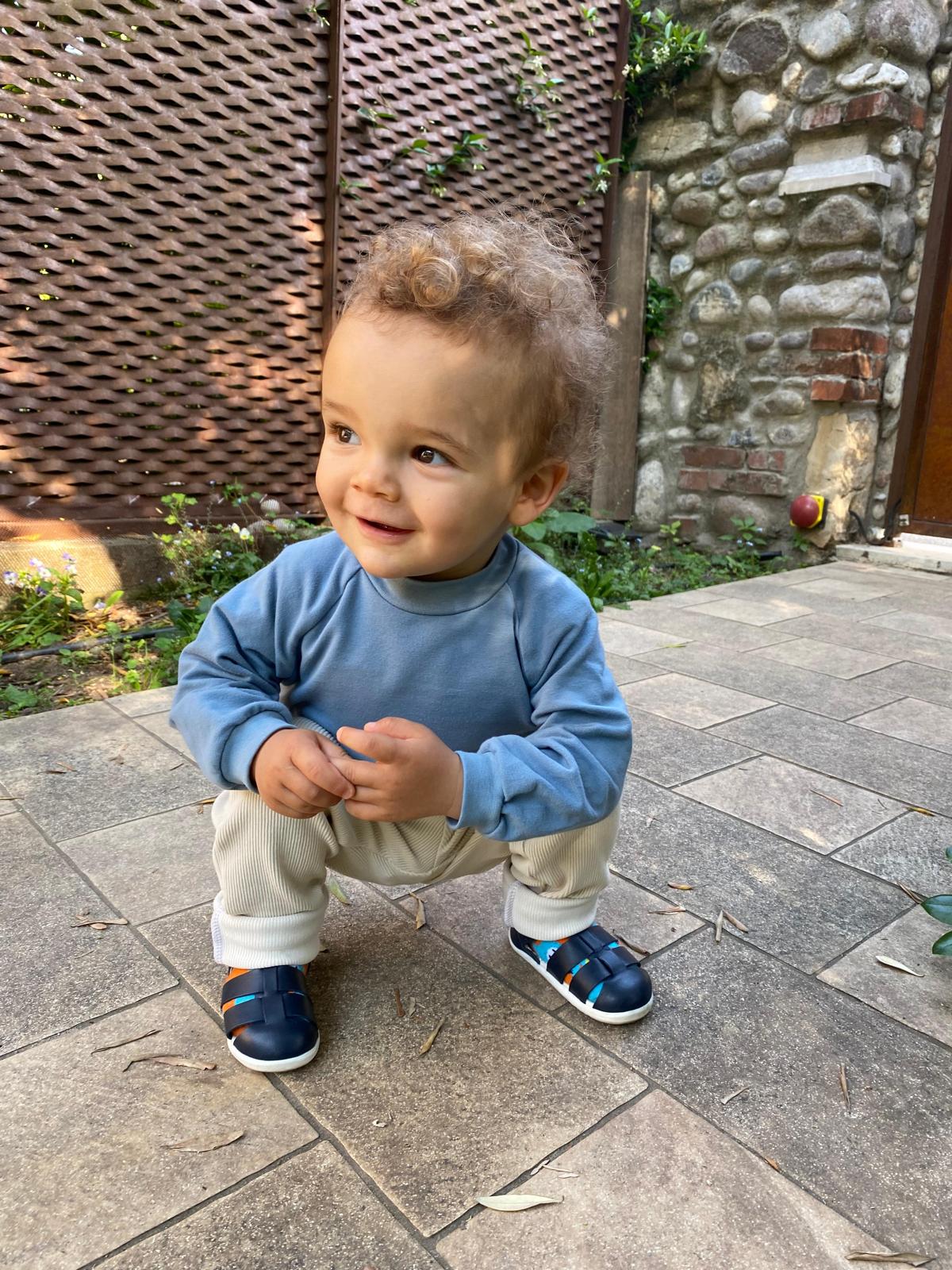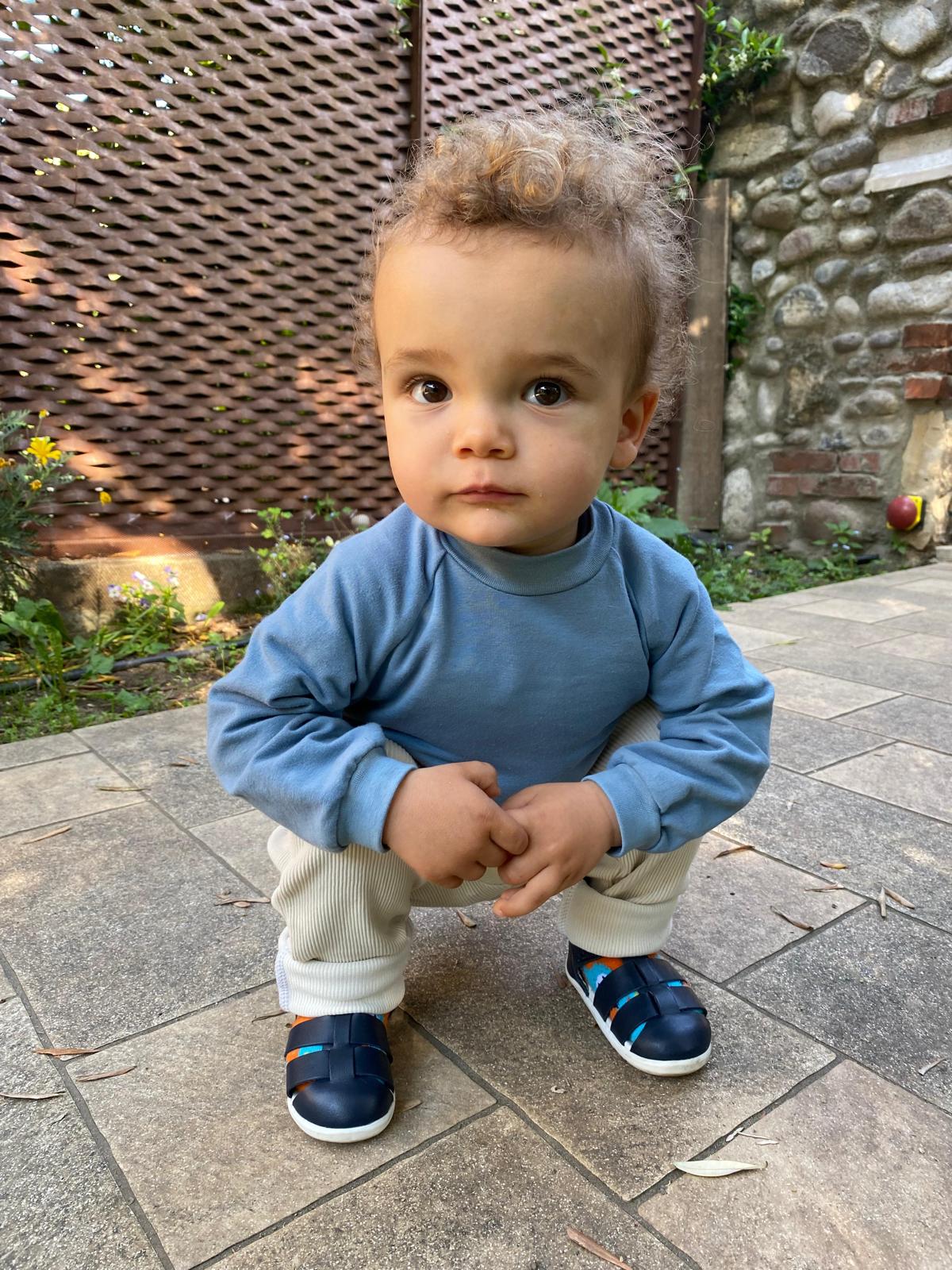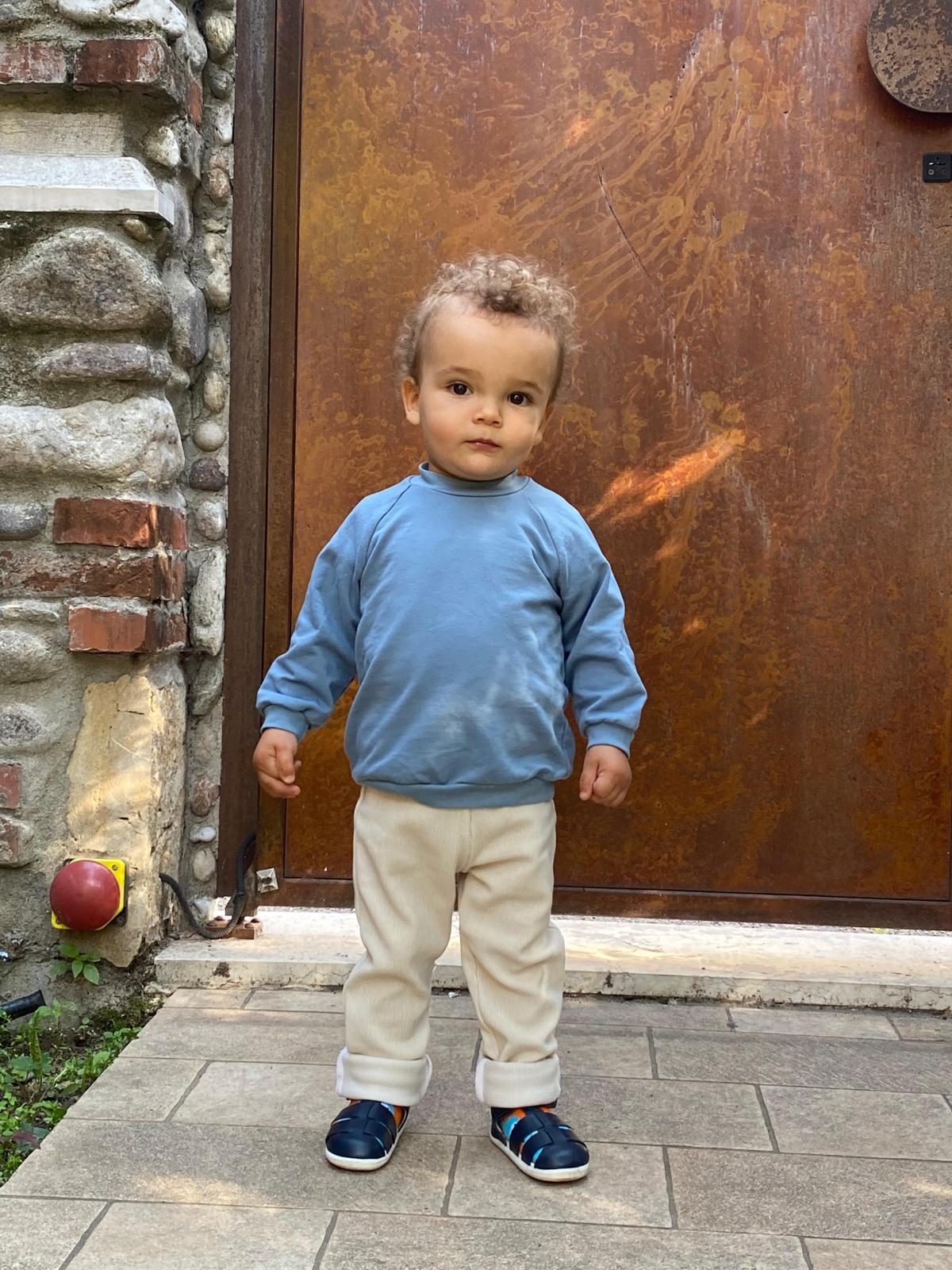 Un completo comodo ed elegante per il tempo libero del tuo bambino. La felpa azzurra con collo alto e i pantaloni a costine color panna in cotone biologico offrono morbidezza e libertà di movimento.