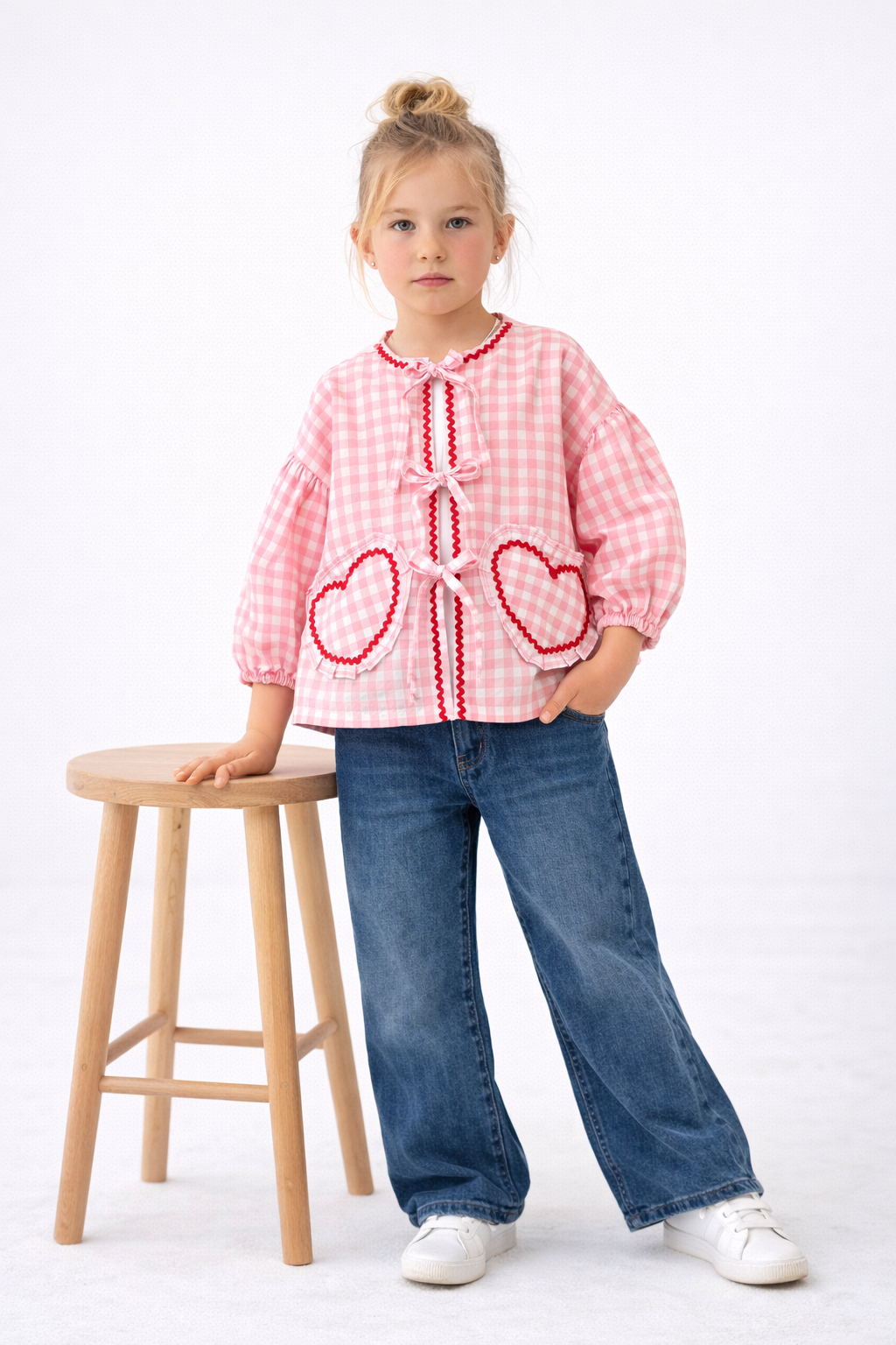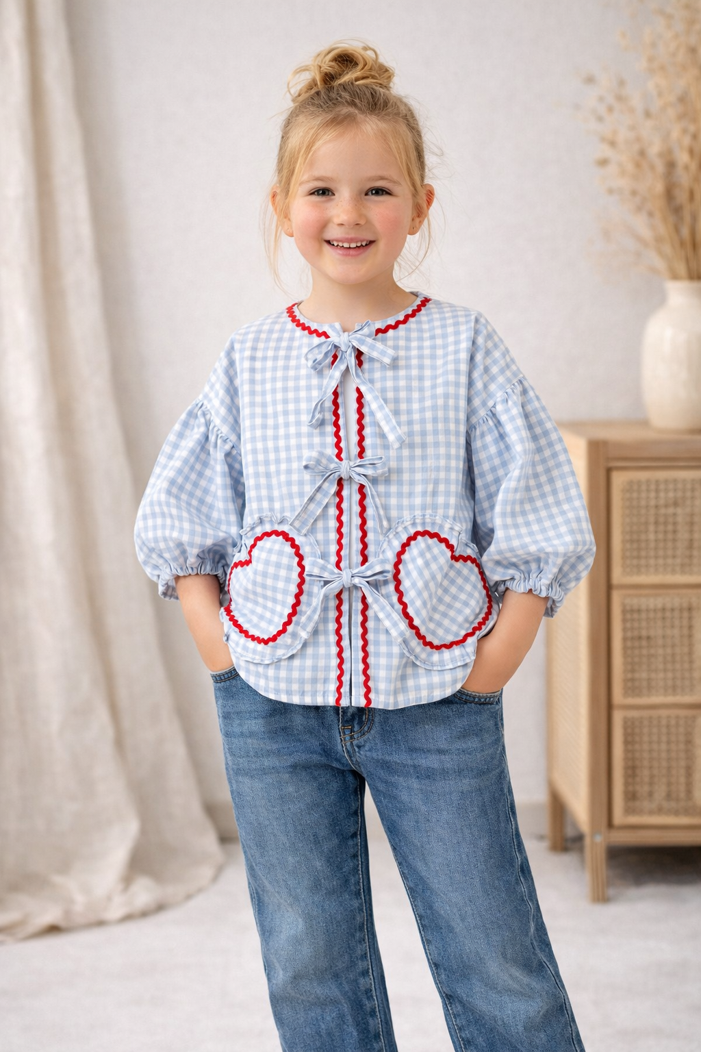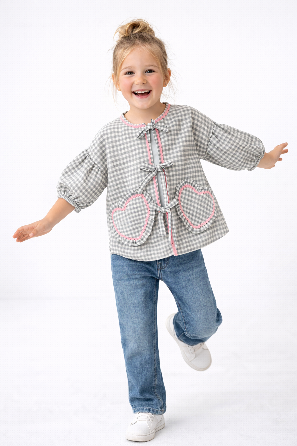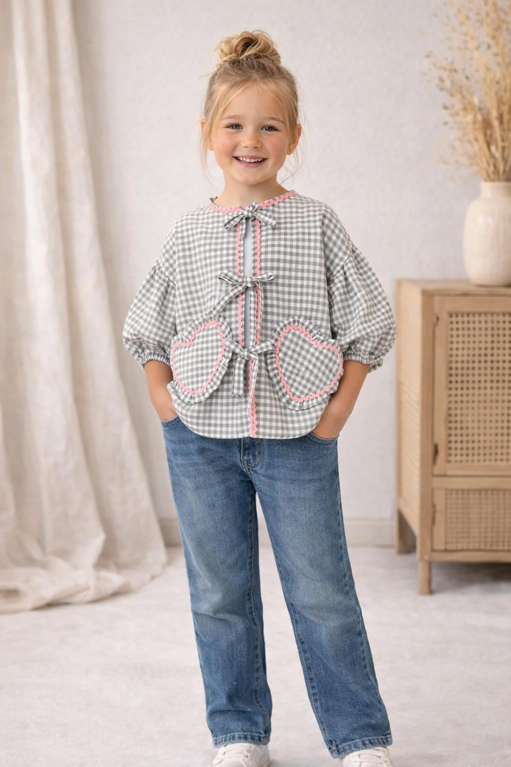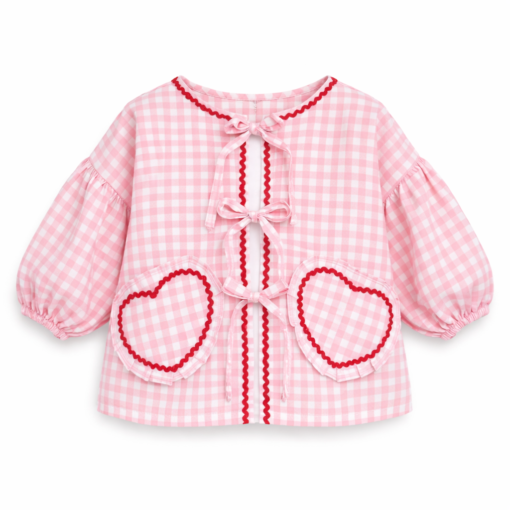 Camicia in tessuto vichy con tasche a forma di cuore e fiocchi decorativi. Maniche a sbuffo con elastico per un comfort perfetto. Disponibile in 3 colorazioni: rosa, grigio e azzurro.